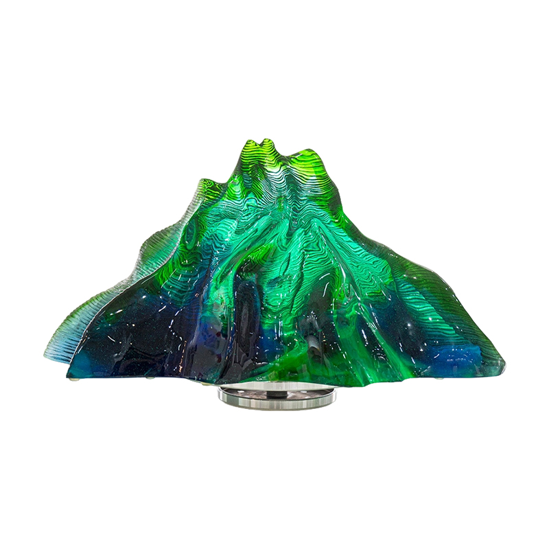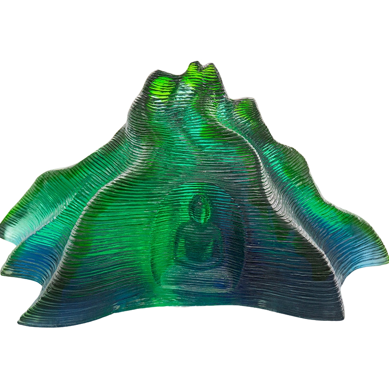Transparansi, gradien warna, dan interaksi cahaya dan bayangan dalam kaca kristal berfungsi sebagai 'media Zen' yang menjembatani masa lalu dan masa kini. Gradien dari hijau menghijau ke biru tua mengambil inspirasi dari hutan lebat dan senja yang tenang di Gunung Anyue, selaras dengan gambaran ‘lukisan pemandangan biru-hijau’ tradisional Tiongkok—menggunakan warna alam untuk menghubungkan kuil gua dengan ritme langit dan bumi. Saat cahaya menembus lapisan kaca, perpaduan warna dan ilusi saling terkait, memunculkan pancaran kabut fajar yang menyelimuti gua. Koeksistensi dialektis antara ‘kekosongan’ (kualitas tembus cahaya) dan “warna” (nada hijau-biru sejuk) kaca menafsirkan wawasan filosofis utama agama Buddha: ‘kekosongan adalah bentuk, bentuk adalah kekosongan.’ Ketika cahaya dan bayangan mengalir melintasi permukaan melengkung, bentuk gunung dan siluet Buddha terus berubah, menganugerahi patung statis itu dengan ‘kekekalan’ dalam sekejap— membangkitkan ketenangan mendalam yang dihasilkan oleh ribuan tahun angin dan hujan di atas batu Anyue. ukiran.
