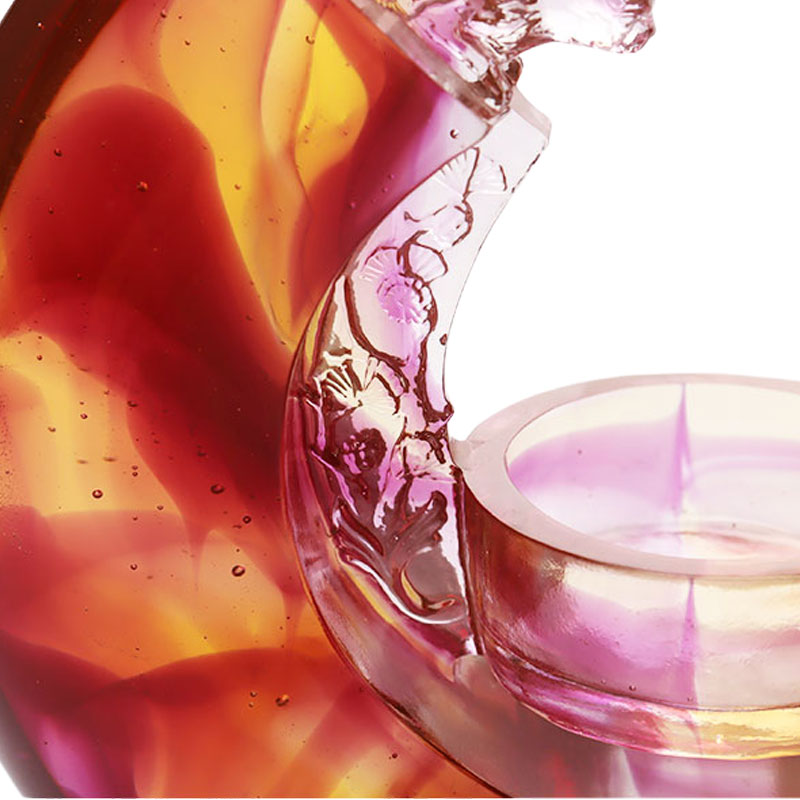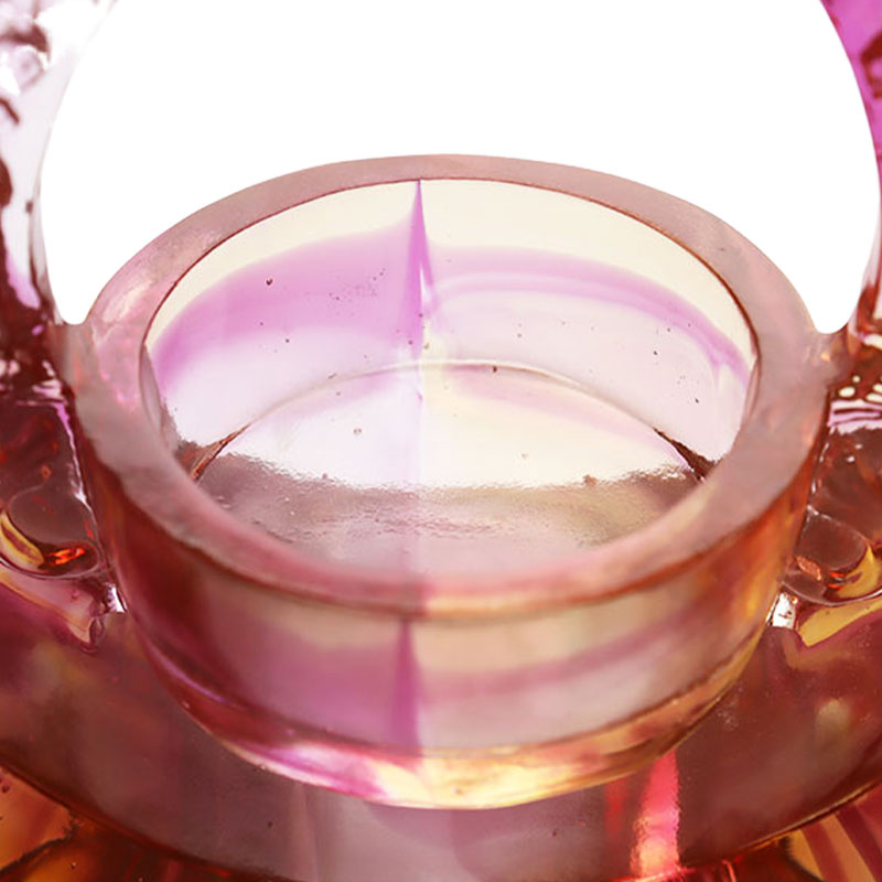 Bahan glasir berwarna memberikan tekstur seperti mimpi pada kandil. Warnanya seindah matahari terbenam. Warna merah, kuning, dan ungu berpadu satu sama lain, dan warna yang mengalir seolah membekukan waktu di momen indah ini. Transisi setiap warna alami dan halus, menunjukkan pesona unik dari glasir berwarna. Bentuk kandilnya cerdik, dengan desain seperti bulan sabit di kedua sisinya, garis-garis halus dan ketegangan, seolah menceritakan ritme yang elegan. Ukiran indah di atasnya halus dan cerah, seperti elf yang menjaga cahaya lilin, menambah kesan misteri dan ketangkasan pada keseluruhan kandil. Bagian tengah tempat lilin diletakkan dirancang dengan indah, praktis dan indah, dan sebaiknya diintegrasikan ke dalam bentuk keseluruhan. Dari sudut pandang pengerjaan, tempat lilin glasir berwarna ini menunjukkan tingkat produksi yang sangat tinggi. Transparansi dan kilau glasir berwarna dibawa ke kesempurnaan, dan setiap detail ditangani dengan tepat tanpa cacat sedikit pun. Baik digunakan sebagai tempat lilin atau dipajang sebagai karya seni independen, ia dapat memancarkan pesona yang memabukkan dan menonjolkan nilai unik seni glasir berwarna.